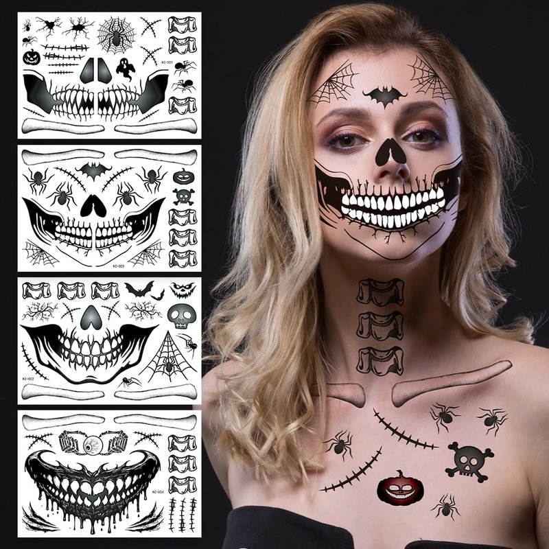- Packing: You will receive 4 pcs skull tattoos, and our Halloween face tattoos each pattern is unique, and seems very realistic and natural. These various pattern tattoos meet your Halloween makeup needs