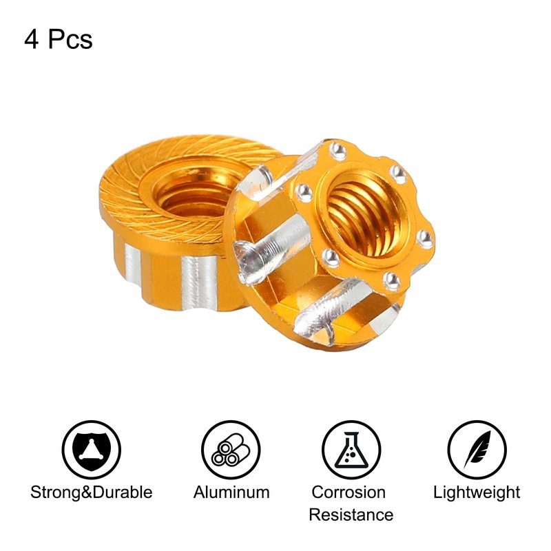 - Aluminum RC Hex Nuts ,is in size of:Nut outside diameter:9mm/0.35 inch;Thickness:5mm/0.2 inch;Thread:M4x0.7;Color: Golden;Material: Aluminum;In the package of: 4 x RC Hexagonal Nuts;