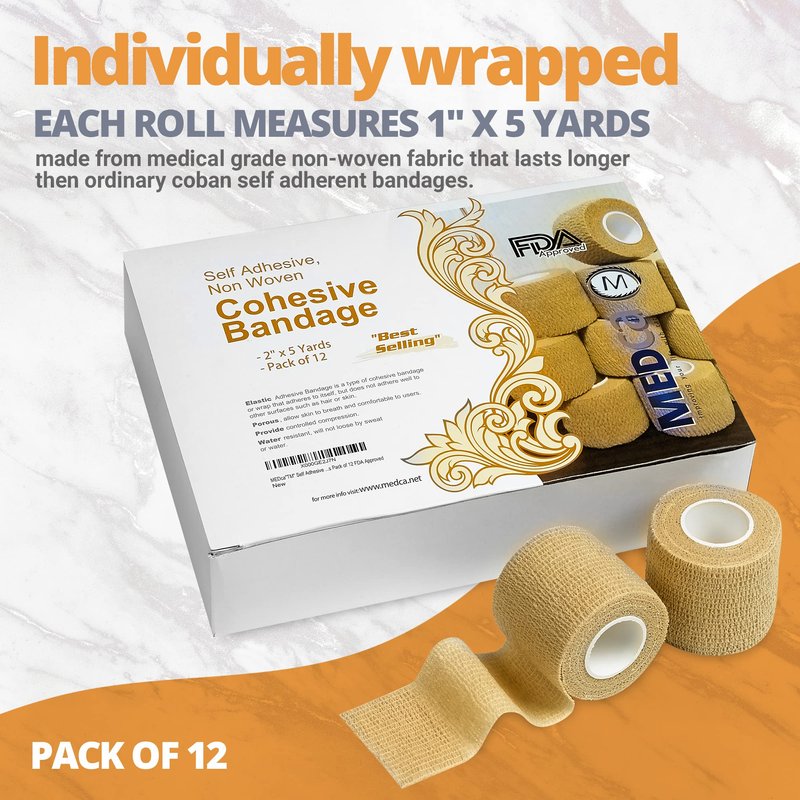 MEDca Self Adherent Cohesive Wrap Bandages 2 Inches X 5 Yards 12 Count with Strong Elastic First Aid Tape for Sprain Swelling and Soreness on Wrist and Ankle (Skin Color)