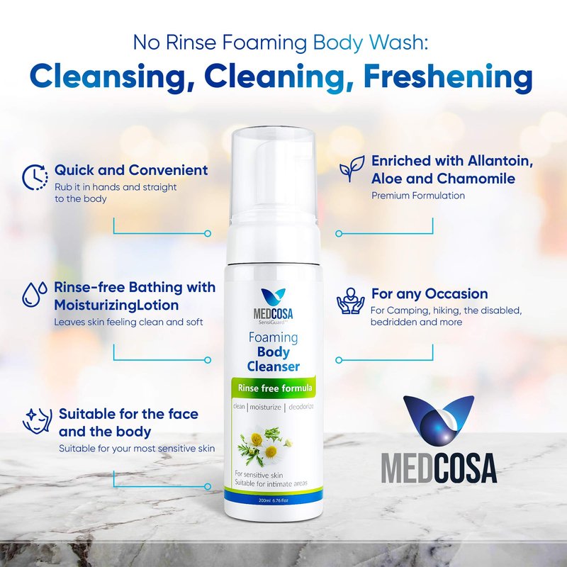 WANT A CONVENIENT SOLUTION FOR GENTLE FULL-BODY CLEANSING ANYWHERE, ANYTIME? Introducing our No-Rinse Full Body Cleansing Foam, the ultimate way to freshen up without the need for water or rinsing. This foam offers a quick and effective cleansing experience, perfect for seniors or individuals with limited mobility. Simply apply the foam to the skin, massage, and towel dry – it's that effortless! Say goodbye to the hassle of traditional bathing and hello to a convenient, on-the-go cleansing solution. Highlights: - Waterless cleansing - Quick and easy application - Portable and convenient - Pleasant scent