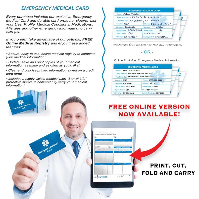 - MEDICAL CARD: Included with your purchase, is our exclusive Emergency Medical Card with a protective sleeve. Carrying a medical ID wallet card provides critical and actionable information for emergency responders.