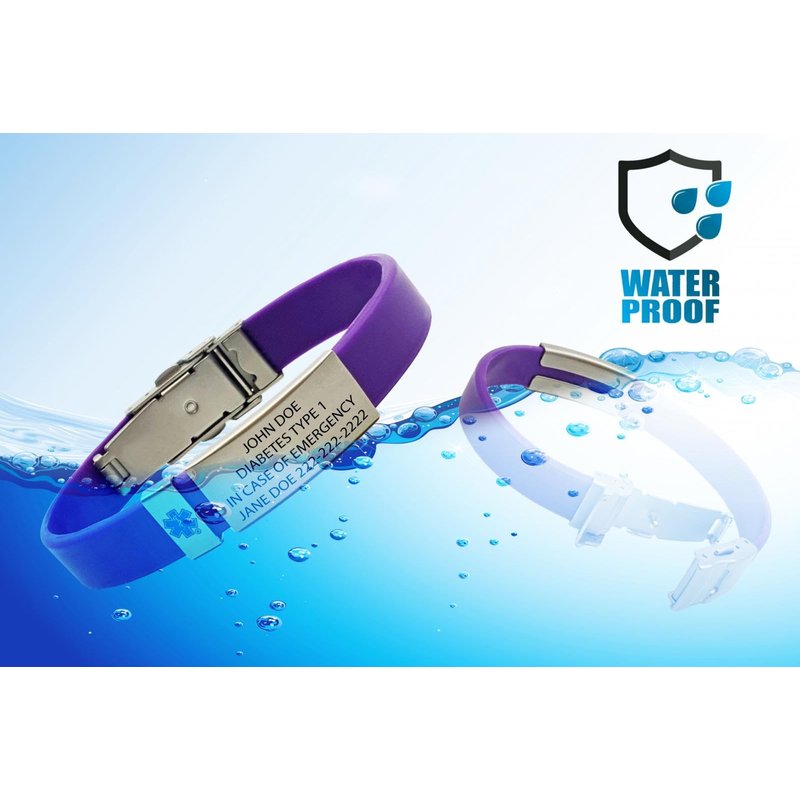 Our newest addition, Waterproof UltraSlim Medical Alert ID bracelets are made from super soft hypoallergenic silicone ensuring a comfortable fit without compromising style. The sleek style of the bracelet measures a mere 12mm wide, smaller than a dime! Choose from any of our five newest colors all designed to match the colorful life of children to adults! The stainless-steel matte finish engraving plate measures 1.5 x .52 inches (37mm x 13.25mm) and allows for 4 lines of custom engraving with each line capable of 25 characters. Your custom engraved message will be attention-grabbing in any emergency with the use of our bold, high contrast black lettering lasered burned into the stainless-steel plate. This bracelet includes a small acid etched and blue color filled medical alert Star of Life badge that can be removed, or added, depending upon your needs and desire. Our UltraSlim medical alert ID bracelets are fully waterproof and are designed to be cut and fit wrist sizes between 5.75 and 9.25 inches. The UltraSlim medical information bracelet comes with our most popular stainless-steel matte finish and a double-lock accordion style security clasp to comfortably wear and remove the bracelet. Each purchase of our engraved medical ID includes our exclusive Emergency Medical Card and protective sleeve for you to add your medications, medical conditions, allergies, and other emergency information to carry with you. You can also take advantage of our optional, no obligation ONLINE EMERGENCY MEDICAL CARD REGISTRY to enjoy the following benefits: Secure, easy-to-use online registry to complete your medical information Update your information as frequently as you want Clear and concise printed data saved on a credit card sized form Includes a highly visible medical alert Star of Life protective sleeve to securely carry your medical information!