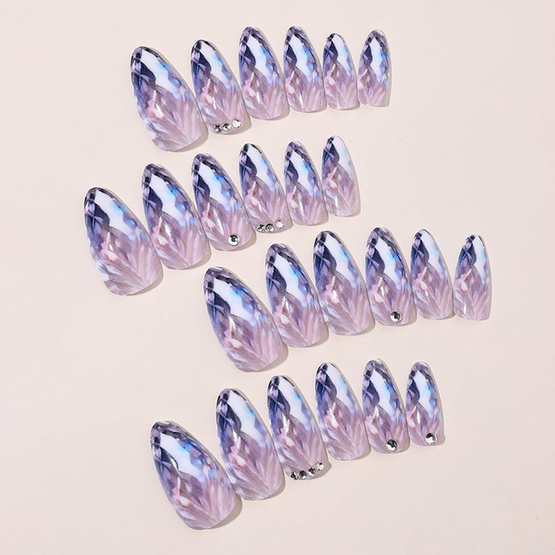 Medium Almond Press on Nails Purple Gradient Fake Nails with Rhinestones Diamond Design Almond Shaped Glossy Acrylic Nails Full Cover Acrylic Nails Glue on Nails for Women and Girls 24Pcs