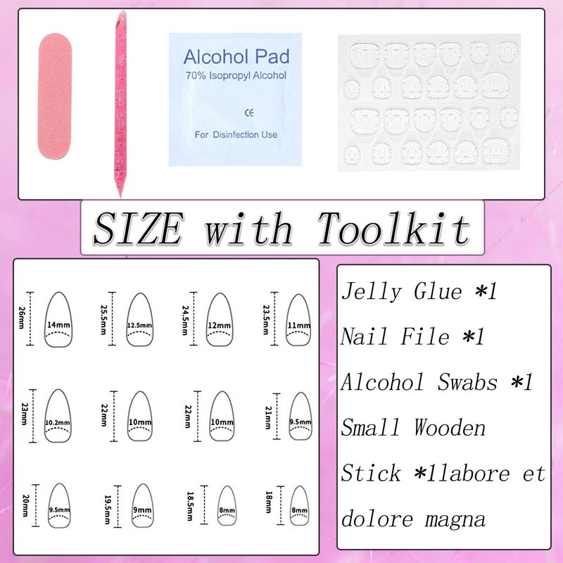 - Package List: 24 pcs medium press on nails almond kit, each box includes 24 fake nails, 1 sheet of 24 adhesive nail tabs, 1 cuticle stick, 1 bottle of nail glue, 1 double sided nail file and gel nail cleaning pads.