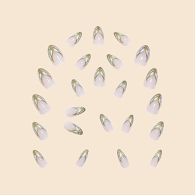 Medium Press on Nails French Almond Fake Nails Gold Butterfly False Nails Tip with Lines Designs Acrylic Nails Nude Pink Glue on Nails Reusable Artificial Nails Cute Stick on Nails for Women 24PCS
