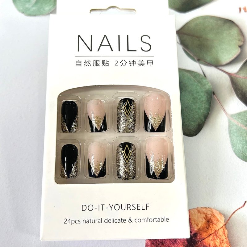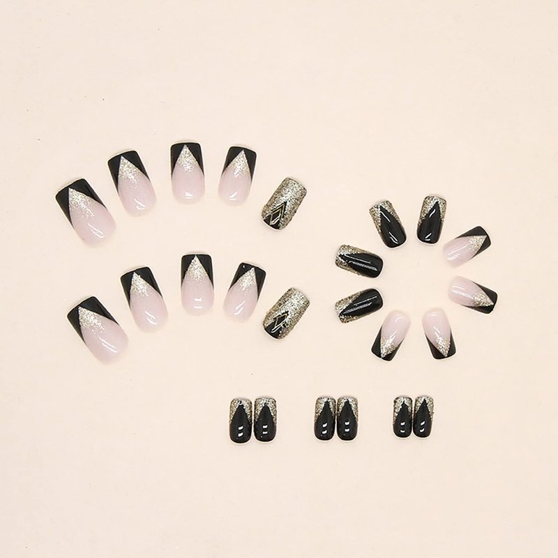24Pcs Black Medium Press on Nails with Gradient Gold Glitter Designs Fake Nails Set for Women Manicure Decorations