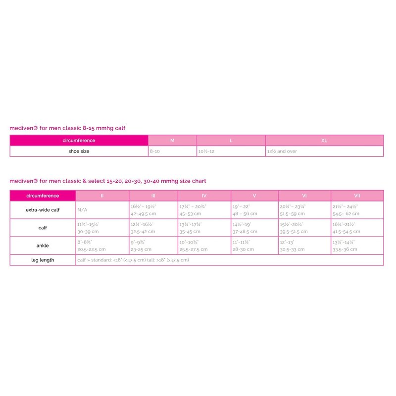 - DESIGN: mediven for Men are anatomically engineered to fit men’s feet with gentle 8-15 mmHg compression designed for both work and casual activities in a classic calf high style.