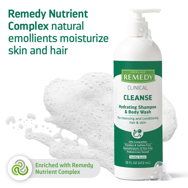 Medline Remedy Clinical Hydrating Shampoo & Body Wash (16 fl oz), Vanilla Scent, Cleanser, No-Rinse, Adults, Kids, Shower Or Bedside, Dimethicone, Sulfate Free