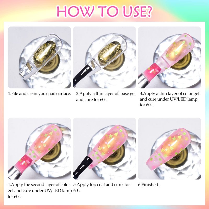 • ⭐【Warm Tips】1. Apply every layer thinner to avoid of not drying, and apply more layers to get better brighten effect; 2. Important to konw that file and clean your nails before applying base coat, in case the gel polish non-stick, no long-lasting or easily peeled off; 3. The glow-in-dark candy gel nail polish should avoid contact with eyes, mouth and skin