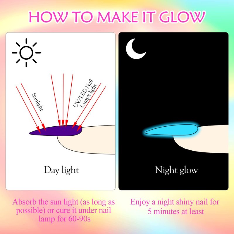 • ☀️【Healthy & Long-Lasting】This candy glow-in-dark gel nail polish has healthy ingredient and low odor, no damage to nails. Under right steps under proper operation, it can lasts for at least 3 weeks(Use with base and top coat and they are not included)