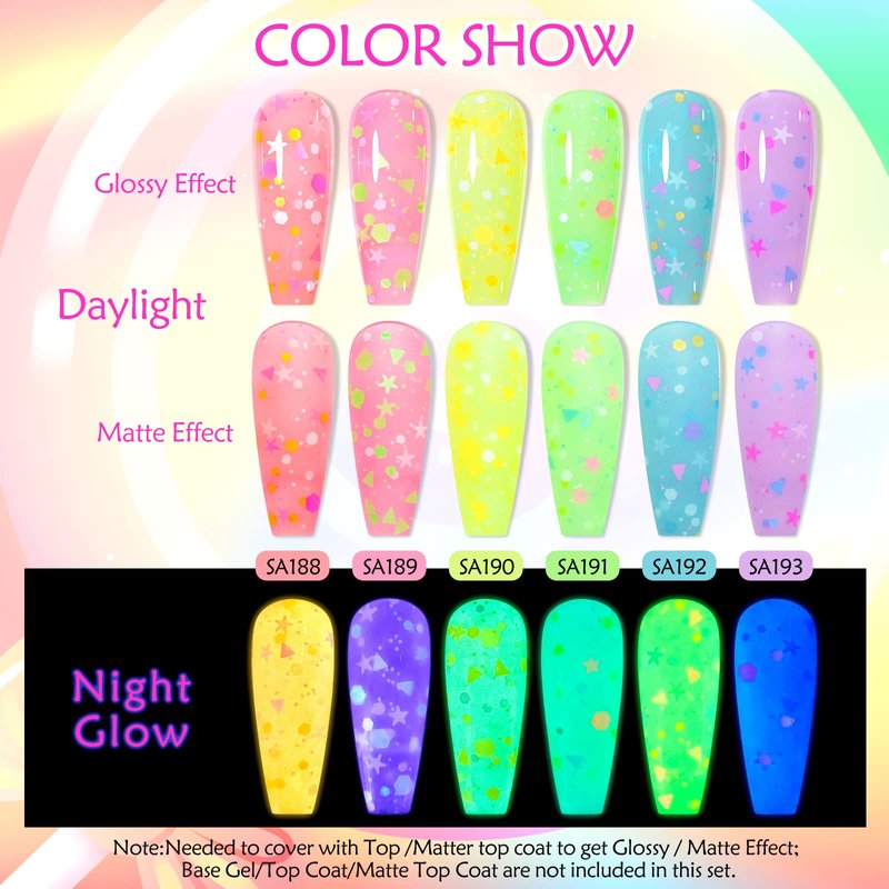 • 🌱【Cute Luminous Gel Nail Polish】The glow in the dark candy gel nail polish mixed with different shape small sequins can show different effects, make your nails look not only cool but also more lovely. Perfectly suitable for masquerades, weddings, Halloween, Christmas, parties, etc