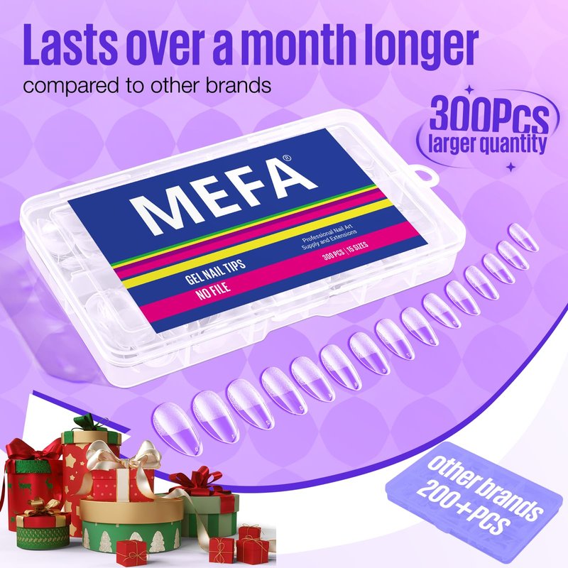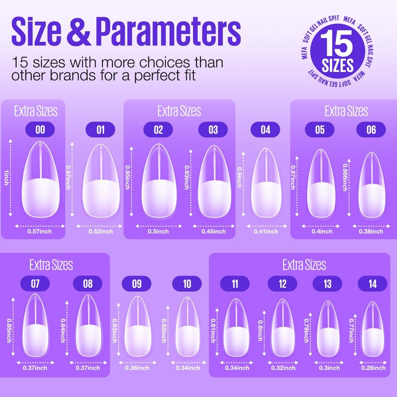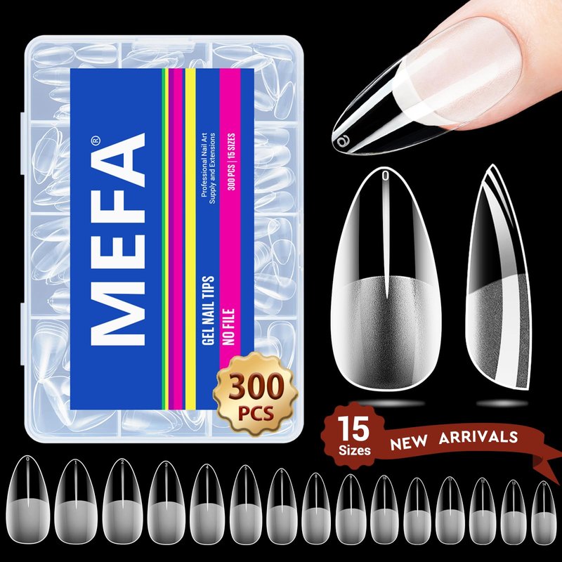 - Upgraded 300Pcs with 15 Expanded Sizes Nail Tips – MEFA 300PCS pre-buff medium almond nail tips with 15 sizes, offering more choices than other brands. Featuring a half-matte texture for better friction and adhesion, making it easy to extend your nails and enjoy DIY manicures