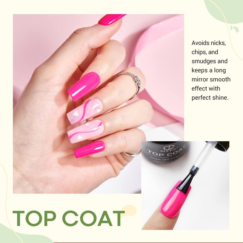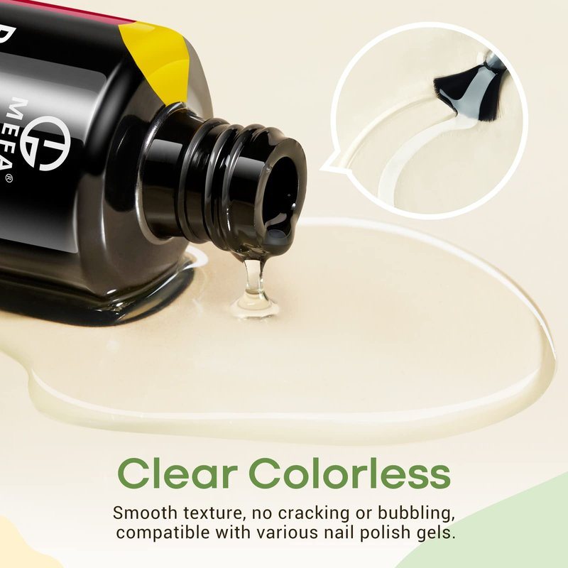 - 【All-round Protection of Your Nails】MEFA BASE COAT: MEFA base coat nail polish can protect your natural nails, increases adhesion between nails and gel color layers and helps the color prevent peeling off. (It is normal for a base coat and color gel to remain a little sticky after curing.) GEL TOP COAT: Seal the color gel, avoids nicks, chips, and smudges, keeps a long mirror smooth effect for 28 days. Each layer can be your nails' guardian.