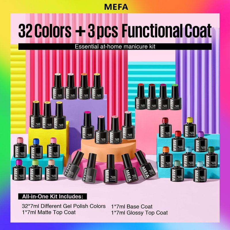- Summer Neon Gel Nail Polish Set: Dive into the vibrant hues of summer with MEFA 32 colors * 7ml neon nail gel kit. Featuring 1 * 7ml glossy top coat, 1 * 7ml matte top coat, and 1 * 7ml base coat, this gel nail polish set captures the essence of the 2024 summer season. With a rich array of colors including red, orange, yellow, green, blue, and purple, our rainbow spectrum ensures endless nail art possibilities.