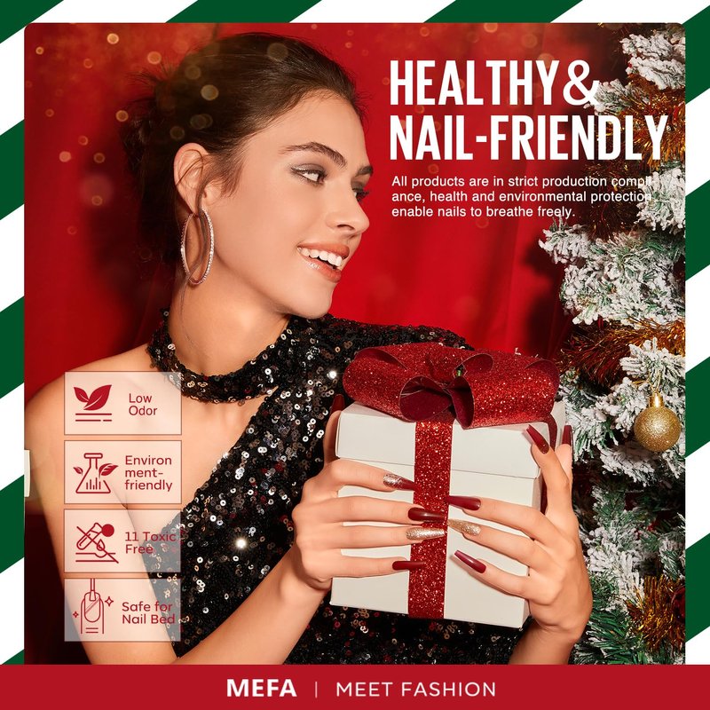 - Christmas Gel Nail Polish Set: Includes 12 X 7ml of different New Year gel polish colors. MEFA has incorporated the popular colors, burgundy red, forest shimmer green, silver rose gold glitter into this product for the 2024 winter fashion trend