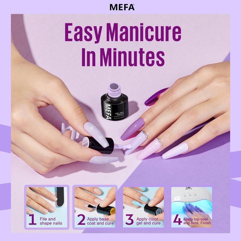 - 💍Long-lasting Brilliance: Enjoy up to 28 days of chip-free wear with MEFA high-performance 2024 summer purple nail gel polish. No more worries about chipping or breakage—simply follow the detailed gel polish instructions, including the use of a gel top coat base coat set, for a manicure that lasts. Achieve salon-quality results in just 3 minutes, making it quick and convenient for any busy individual.