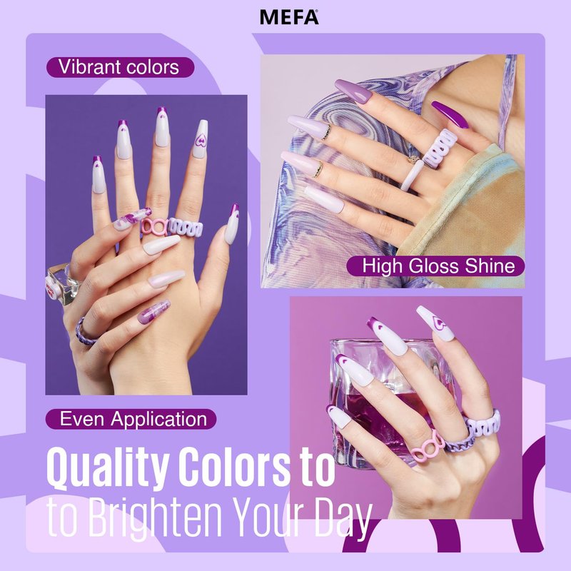 - 🟣Healthy Formula: MEFA plum grape purple gel polish set is crafted from natural ingredients, ensuring your nails remain healthy and odor-free. Upgrade your manicure application with nail polish color shades like violet, lavender, lilac, soft pink, and a touch of iridescent purple shimmer. Say goodbye to salon expenses and hello to a budget-friendly, DIY nail art home experience.