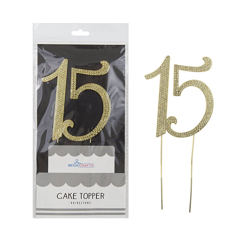 Mega Crafts Sparkly Gold Rhinestone Number 15 Cake Topper Decoration | Shimmering Gold Crystals & Durable Alloy Metal | For Birthdays, Anniversaries, Centerpieces, Party Favors, Celebrations & More