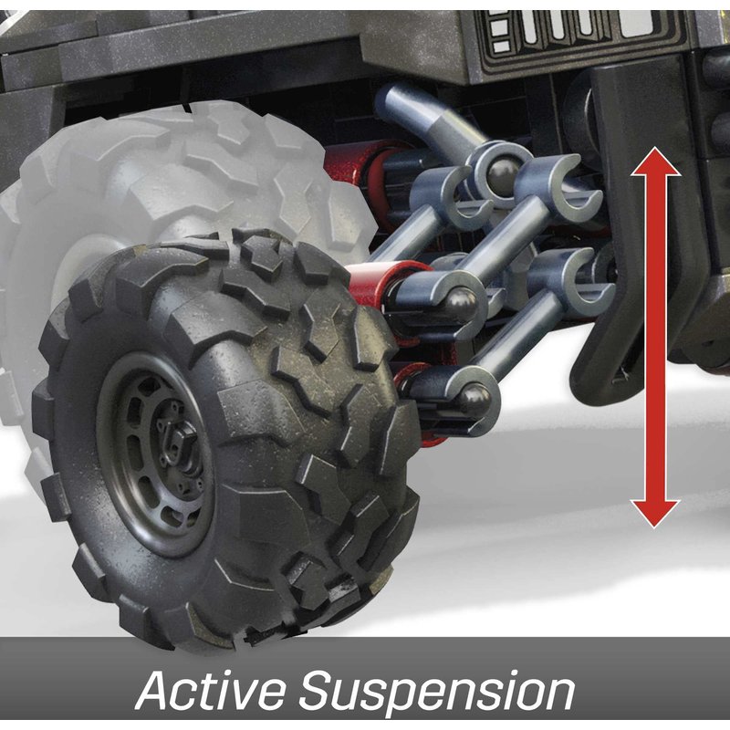 - Halo Infinite inspired UNSC Razorback transport vehicle building set with 2 front seats, large tonneau, treaded rubber tires and active suspension