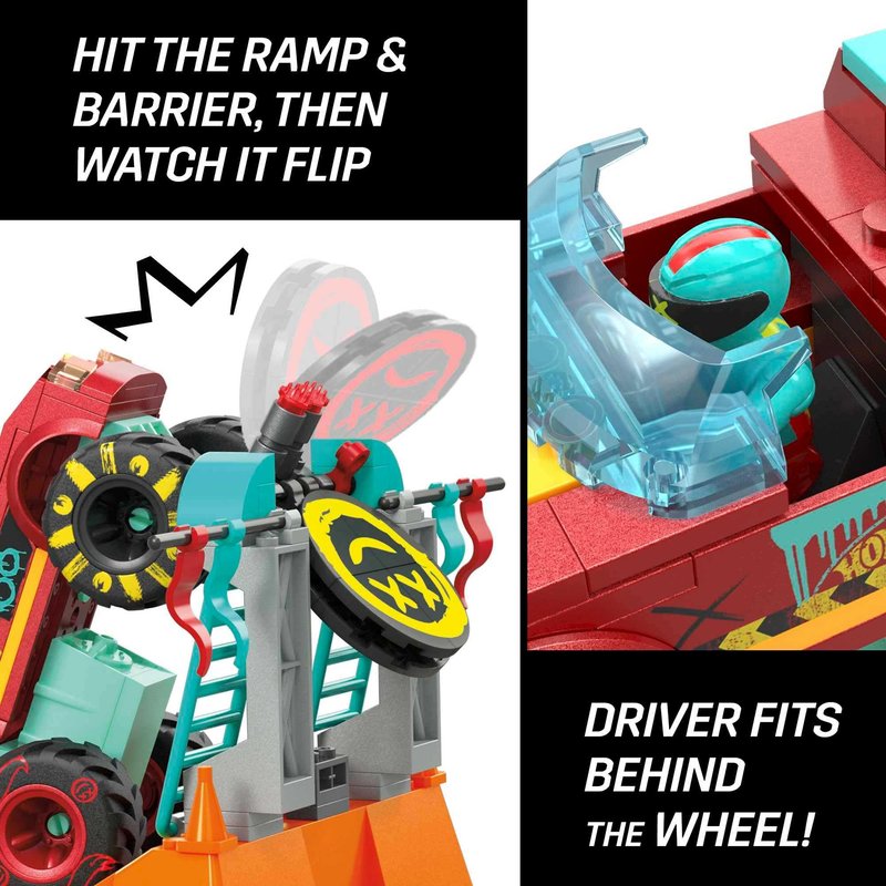 Mega Hot Wheels Monster Trucks Building Toy, Demo Derby Extreme Trick Course with 151 Pieces, 1 Micro Action Figure Driver, Red, Kids Age 5+ Years