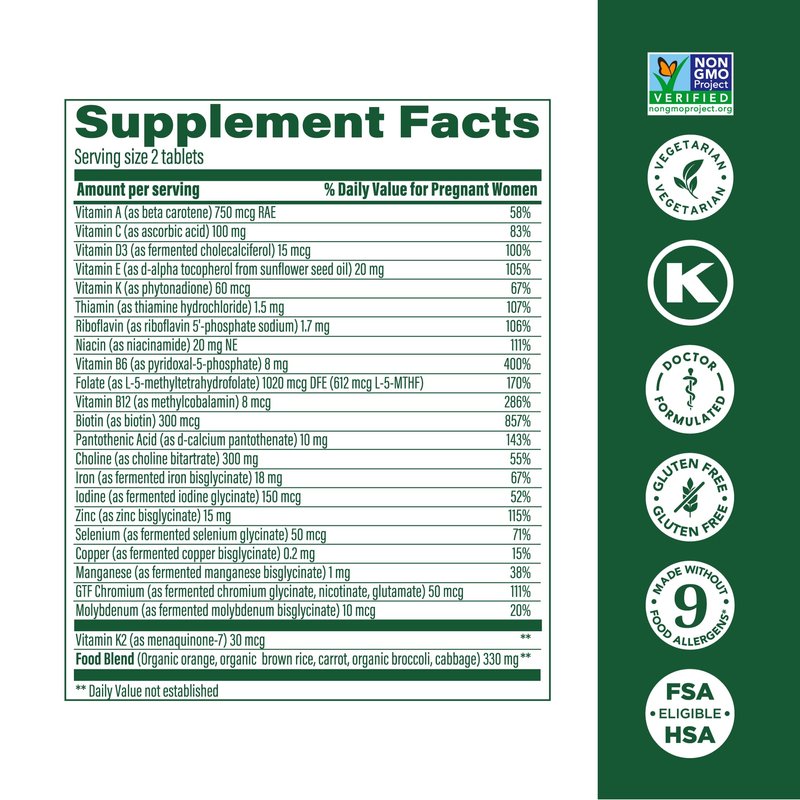 MegaFood Baby & Me 2 Prenatal Vitamin and Minerals - Vitamins for Women - with Folate (Folic Acid Natural Form), Choline, Iron, Iodine, and Vitamin C, Vitamin D and more - 60 Tabs (30 Servings)