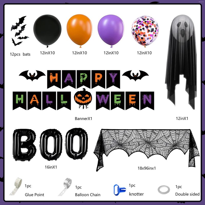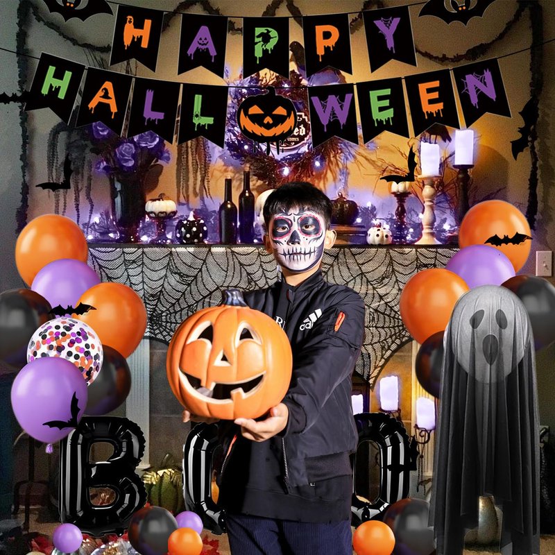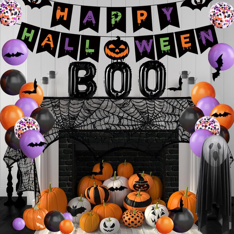- Package Includes: You will get 3 x Boo shaped balloon(3 aluminium film balloons form a BOO when inflated), 40x latex balloons 12 inches, 1 x fireplace mantel scarf (18" x 96"), 12 PCS*3D bat wall stickers (4 different sizes) and 1x Happy Halloween banner, quite enough to meet your Halloween decorations needs. Let's kick off this fall season with spooky indoor Halloween decorations