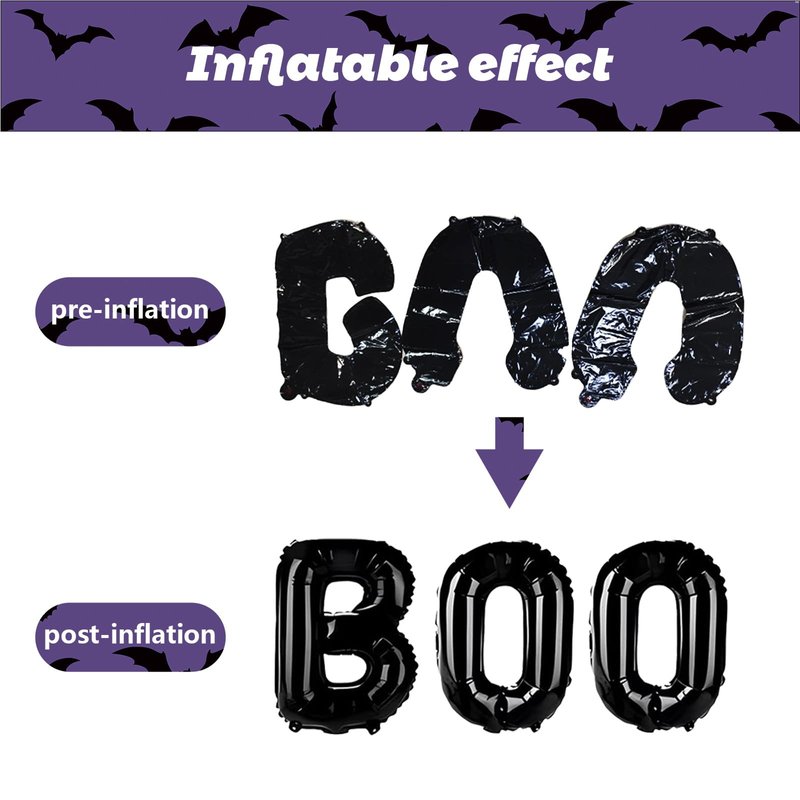 - BOO Party Decorations: 3 aluminium film balloons form a BOO when inflated. Halloween balloons are made from premium latex for durability and vibrant colors, perfect for a wonderful halloween party. 3.3x6.6ft Black netting and a ghost face balloon can be built into a black ghost