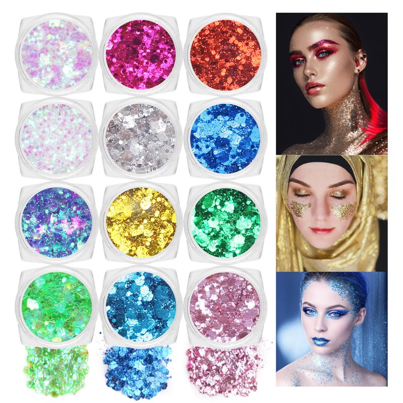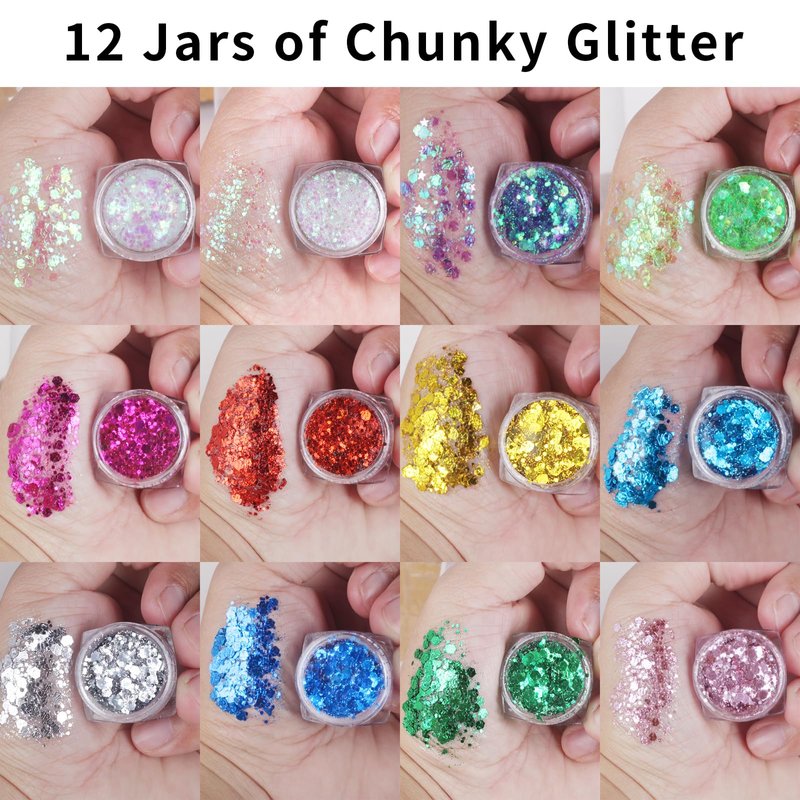 - Multiple Colors Face Glitter Palette:12 jars of face paint glitter gel with different colors in a palette,including red face glitter,blue face glitter,pink face glitter,light purple face glitter,gold face glitter,green face glitter,clear white face glitter,silver face glitter,light blue face glitter,lime green face glitter and purple face glitter,multiple colors can meet your need to match any makeup finish