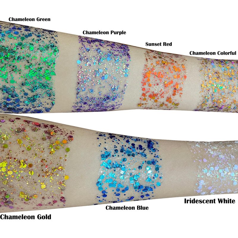 - Sparkly Chameleon Glitter Makeup:MEICOLY Chameleon green body glitter has lots of glitter in the gel with beautiful color.This glitter is super dense in the gel and shimmers pretty in the light,it has a lovely shine and is stunning when the light hits it.The color shifts from different angles,also looks great in sun