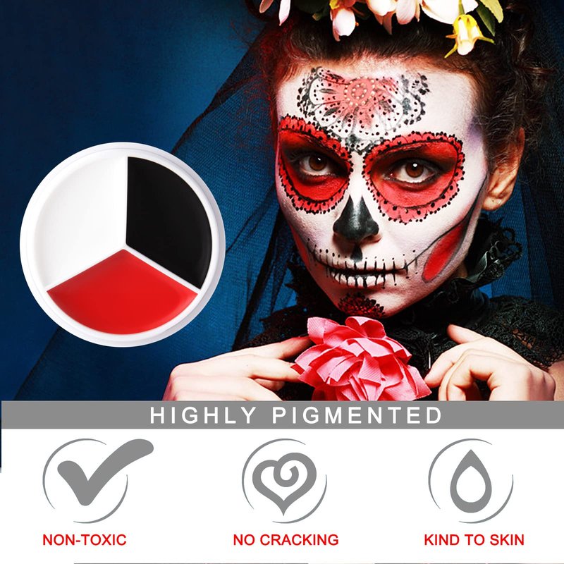 - EASY TO APLLY AND CLEAN --- Smooth Halloween makeup is easy to apply with a sponge, brush or fingers,no fading or cracking.Avoid pulling or stretching the skin.White face paint is easy to wash off with makeup remover,Black and Red face paint need to be washed by olive oil or oil base professional makeup remover