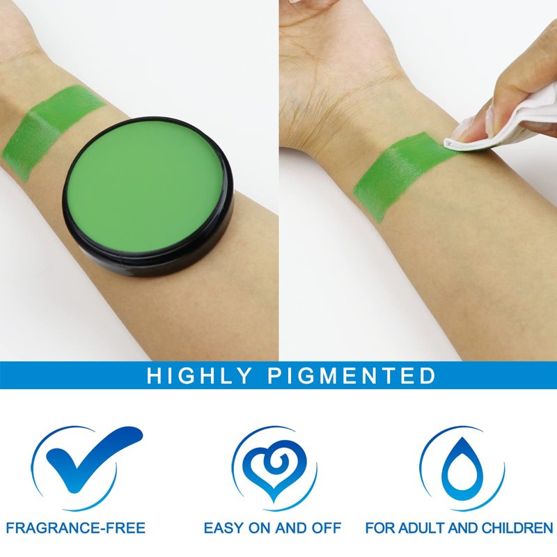 - ✔VEGAN&CRUELTY-FREE&NON-TOXIC --- Hypoallergenic and no fragrance.Won't itch or irritate skin,great light green face paint for kids.Notice:As with all cosmetics we advise that a small skin patch test is done before applying as everyone's skin is different