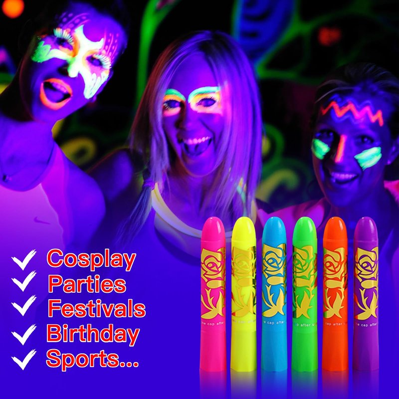 Neon Face Paint Sticks with 6 neon colors is portable and easy to clean. Washable face paints include yellow face paint, purpul face paint, pink face paint, blue, orange and green face paint makeup. Glow Body Paint is easy to color.
