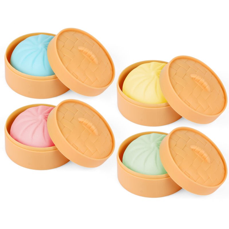 MEIEST 4 PCS Colorful Dumpling Stress Balls Fidget Sensory Toy,Squeeze Dough Ball Stress Relief Hand Toy,Bun with Food Steamer Stretchy Desk Toys