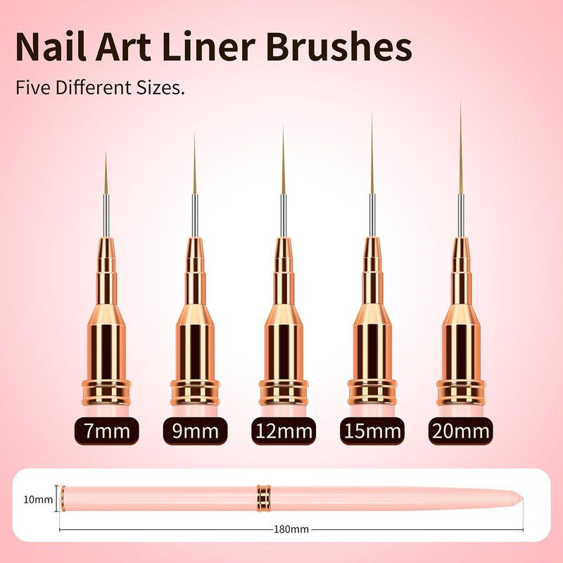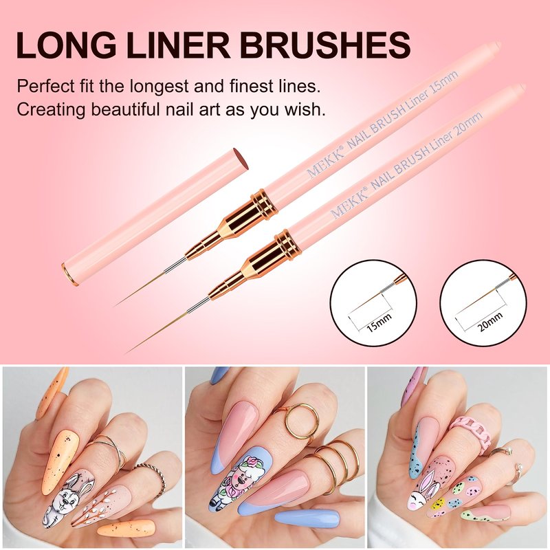 • ❤Professional Nail Art Liner Brushes:MEKK nail art brushes with five different sizes:7mm, 9mm, 12mm, 15mm, 20mm. These liner brushes are perfect for tiny details, delicate and exquisite patterns, fine lines of nail designs. It's super suitable for professional nail salons or beginners diy at home. Do nails with these technical nail supplies now!
