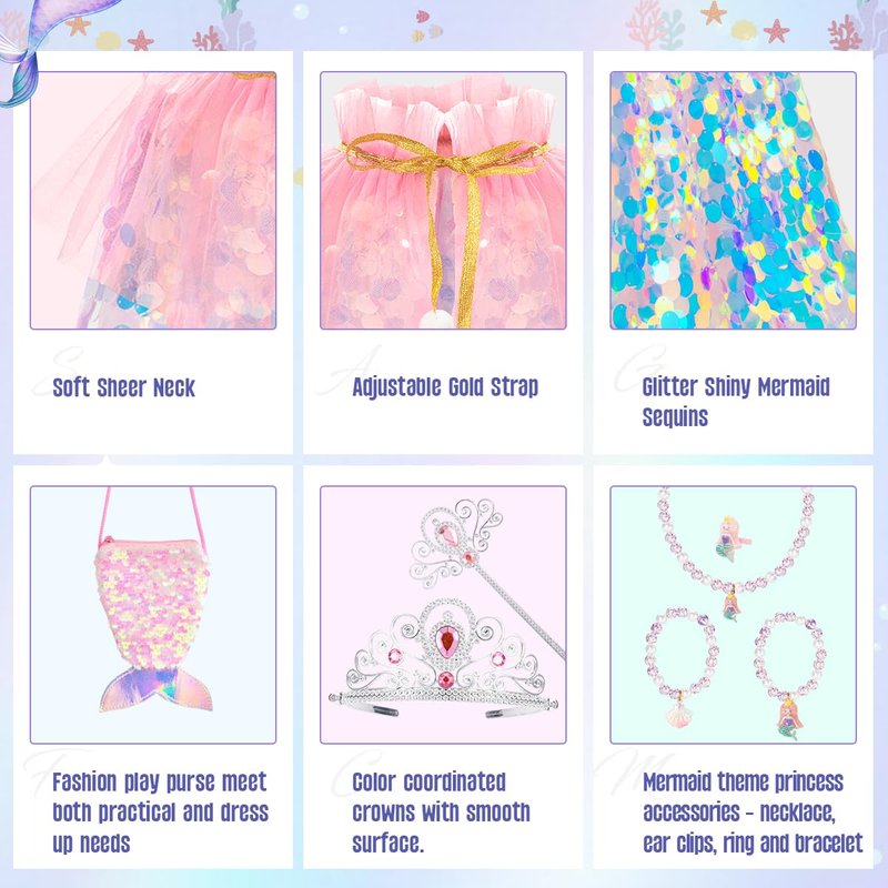 - Pink Shimmer Sequin Cape & Mermaid Toys Accessories as The Perfect Sparkle for Your Little Princess. Dazzling kids dress up cape design inspired by mermaid princess and girls' favorite pink color combo. Pair it with the rich princess mermaid toys collection - princess crowns for little girls, necklace, bracelet, ear clips, ring, wand, gloves and pink mermaid bag.