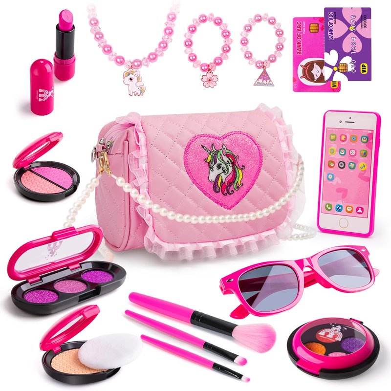 - A Hit for Your Little Princess Gifts Addition. With a cute pretend play toy phone, sunglasses, kids purse, credit card, and a bunch of fun makeup accessories, this set is sure to be a must-have and become their new favorite toy in home's nursery, kid's bedroom or playroom. Designed for use by children ages 3 4 5 6.