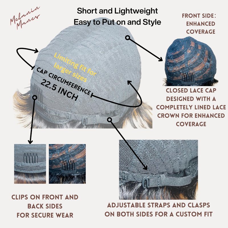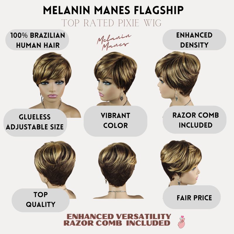 Brand name: Melanin Manes (Celebrate your melanin, embrace your power) < br>< br> Hair Quality: 100% Brazilian virgin human hair< br>< br> Hair Style: Pixie Cut< br>< br> Unit Weight: 88g< br>< br> Hair Density: 180% density< br>< br> Cap size: 22-22.5 inch medium cap size with adjustable straps< br>< br> Color: Jet Black (1B); Black with Auburn Highlights (1/30); Dark Brown with Strawberry Blonde Highlights (4/27); Burgundy (99J), Ginger Orange (350); Honey Blonde (30); Chocolate Brown (4) < br>< br> Accessories: Complimentary Razor Comb and Wig Cap< br>< br>