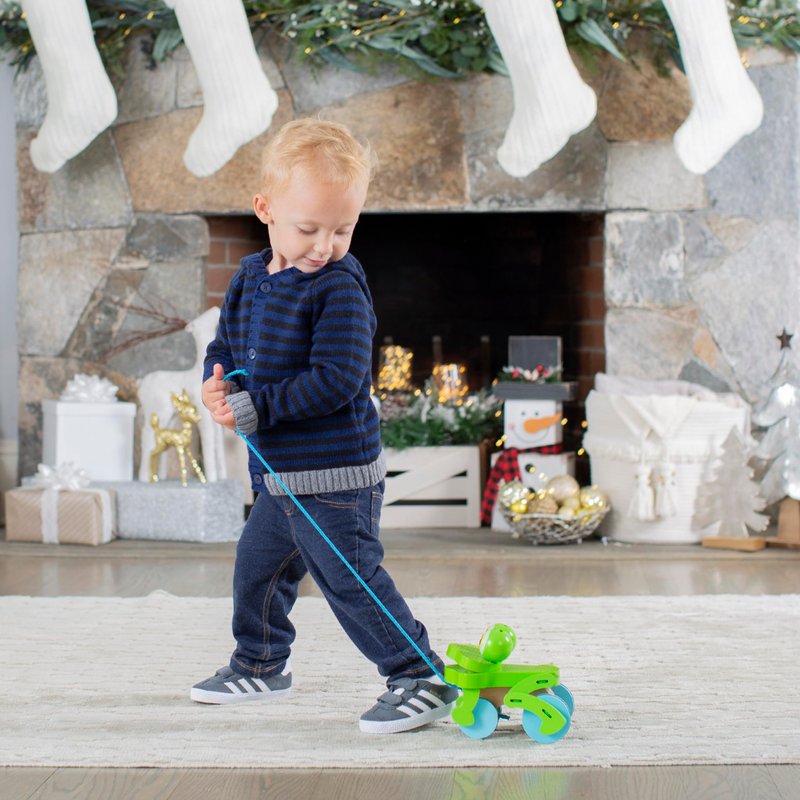 - Encourage young ones to go on the move with this adorable wooden bright green and polka-dot frog pull toy