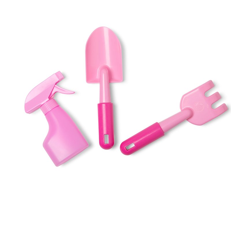 - Garden tools--shovel, rake, and spray bottle--made of easy-clean plastic