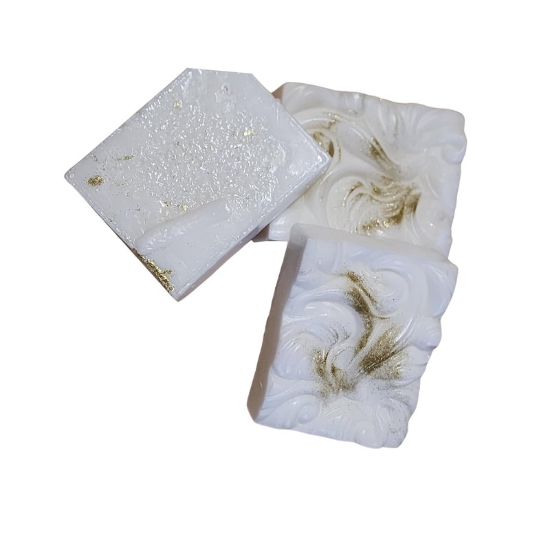 Indulge in the luxurious experience of Melody, a handcrafted soap that combines the best of both worlds. Half of the bar is made with a creamy white base, while the other half boasts a rich shea butter base, ensuring a nourishing and moisturizing cleanse. Infused with the refreshing scent of cucumber melon essential oils, this soap offers a delightful aromatic escape. The addition of shimmering gold glitter adds a touch of elegance and sophistication to your bathing routine. Treat yourself to the ultimate pampering with Melody's unique blend of ingredients and captivating visual appeal.