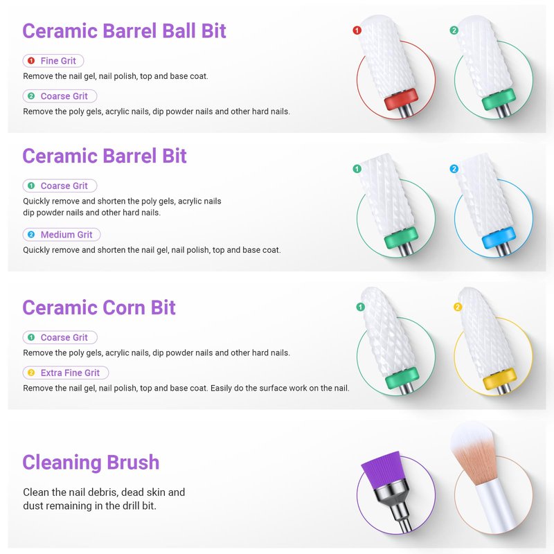 - ALL-IN-ONE SET: The nail drill bit set includes 6pcs ceramic nail file bits, 8pcs diamond carbide drill bits, 5pcs basic nail drill Bits, 1pcs cleaning brush, and 1pcs long cleaning brush. Our nail drill bits kit comes with a metal portable holder, that can store up to 25 nail drill bits, suited for both beginners and professionals.