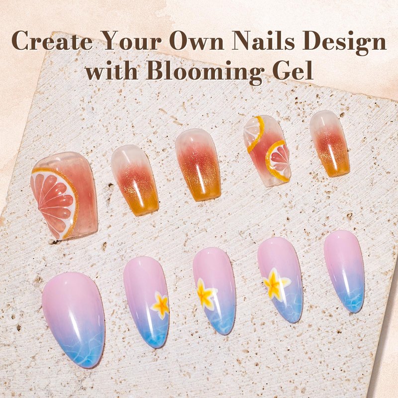 - Natural Blooming and Borderless Effect: Inspire your nail art creativity with our beginner-friendly sheer blooming gel polish, and easily achieve borderless, natural-looking blooming effects. Start with a cured basecoat, add a cured color gel, and then a thin layer of blooming gel without curing. Design your pattern, let the bloom appear, cure it, and finish with a top coat. Mix with products like chrome for even more artistic designs.