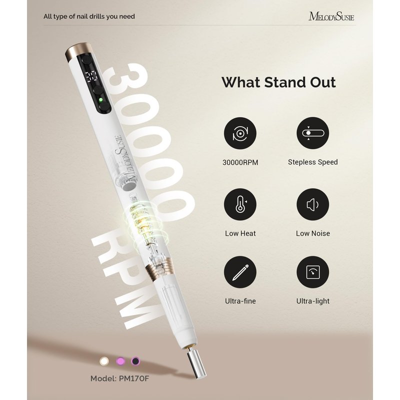 - 【Low Noise and Low Vibration】MelodySusie PM170F Nail Drill features a powerful yet quiet motor with smart heat dissipation. It comes with an upgraded motor and overload protection mechanism to extend its lifespan. Additionally, its spring construction makes it quiet and low-vibration for a more enjoyable experience. (Note: It is recommended to give the machine a rest after 20 minutes of continuous use.)