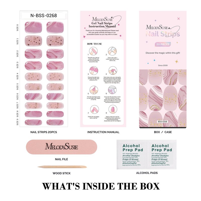 - Exclusive Design: MelodySusie's gel nail strips designs for any occasion (shopping, dating, friends gathering, wedding, gifts, Christmas or simply at home). Nail strips ranging from solid colors and french tips to glitter and patterned designs, MelodySusie has the perfect semi cured gel nails style for every occasion.