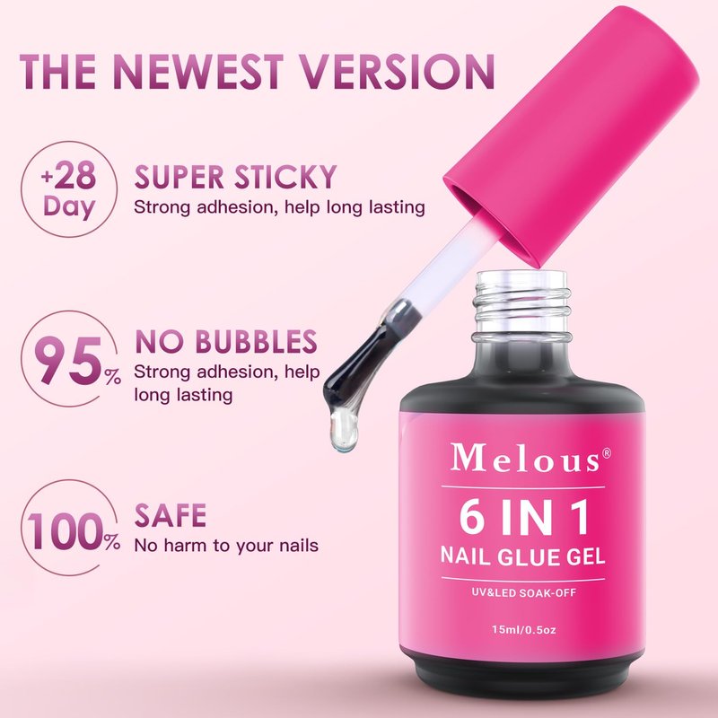 - Nail Tips Glue: Melous 6 in 1 nail glue gel helps stick nail tips quickly and easily, the glue didn't peel, chip, shift, or pop off the natural nail. Durable glue and long lasting for press on nails, false nails, soft gel nail tips