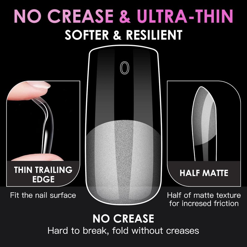 - 【PRE-SHAPED NAIL TIPS】Pre buff half matte nail tips provide you with a comfortable, flexible, and easy-quick nail enhancement in 20 minutes or less, This full cover soft jelly tips kit contours to the nail perfectly from cuticle to free edge. Last 4 weeks with proper application