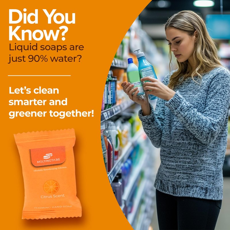 Join the MELTINGTABS Community: Embrace smarter cleaning solutions with our hand soap refill tablets, designed to simplify everyday tasks while reducing environmental impact. Infused with a refreshing citrus scent, these tablets leave your hands smelling delightful and clean. Eco-Conscious Packaging: Say goodbye to bulky plastic waste with our thoughtfully designed packaging, featuring individual paper packets. Use any foaming soap dispenser you have at home to make refills easy and convenient. Effective Cleaning Formula: Enjoy a foaming soap that cleans effectively and leaves your hands feeling soft and fresh. MELTINGTABS isn’t just about clean hands—it’s about making a positive impact on your home and the environment. Towards a Sustainable Future: Discover the convenience and simplicity of our hand soap refill tablets and join us in creating a brighter, more sustainable future.