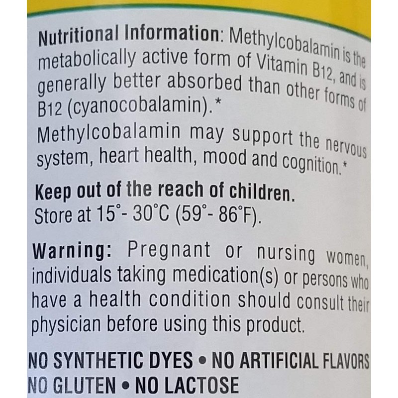 Sublingual Vitamin B12 is formulated with methylcobalamin, a naturally active form of B12 in the body, so it's naturally better for you. Methylcobalamin is more readily absorbed and retained by the body to provide greater daily energy and alleviate occasional fatigue, promote a healthy metabolism and overall cardiovascular support. B12 is also known to support cognitive health and brain function, a healthy nervous system and provide for a strong immune system.