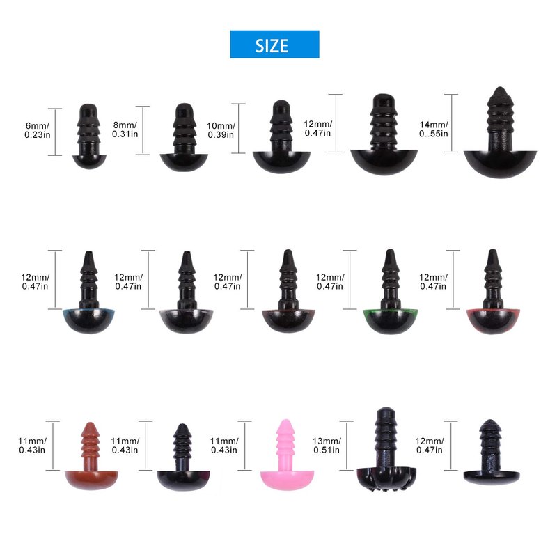 - Assorted Sizes-5 different sizes of plastic eyes ranging from 8 to 14mm(0.31-0.55inch) ART SUPPLIES, and 2 different sizes for safety nose 10*11mm(0.39*0.43inch) and 10*13mm(0.39*0.51inch), meet your different needs