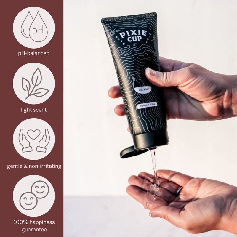 - Versatile. The Pixie Cup Gel Wash also makes a gentle and cleansing feminine wash. Eliminate a bottle in your shower and use this to do two jobs at once. pH balanced, plant-based, biodegradable, with no harsh chemicals, parabens, or preservatives.